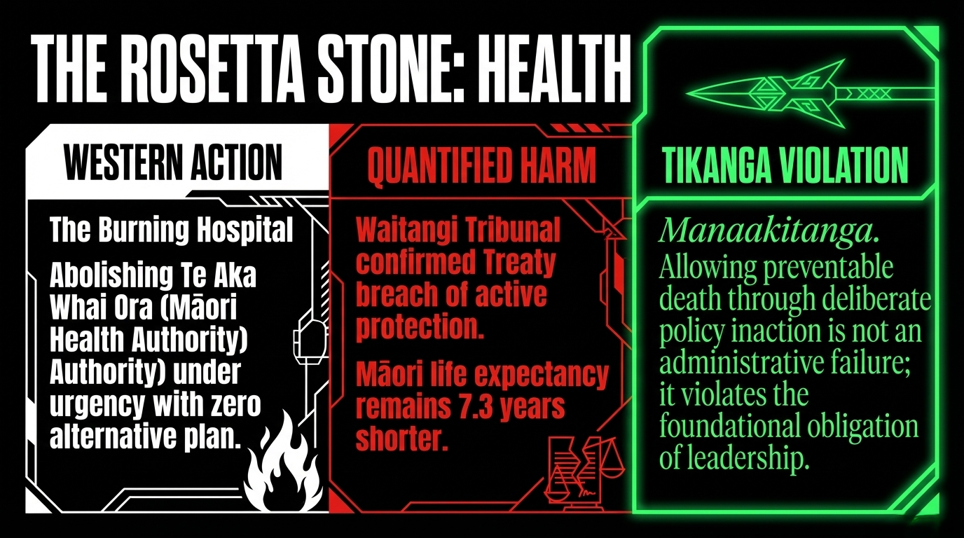 Te Aka Whai Ora — the Māori Health Authority, established by the 2022 Pae Ora legislation to address Māori health disparities — was abolished under urgency, without consultation with Māori. As confirmed by Te Ao News in November 2024, the Waitangi Tribunal found this breached Treaty principles including tino rangatiratanga, partnership, good faith, and active protection. The Tribunal was explicit: the Crown had no alternative plan for Māori health outcomes. The decision was driven by political expediency. As The Māori Green Lantern's Poison Tree essay documents: "Te Aka Whai Ora — the only health authority focused on closing that gap — was just abolished. The poison tree is still standing."
