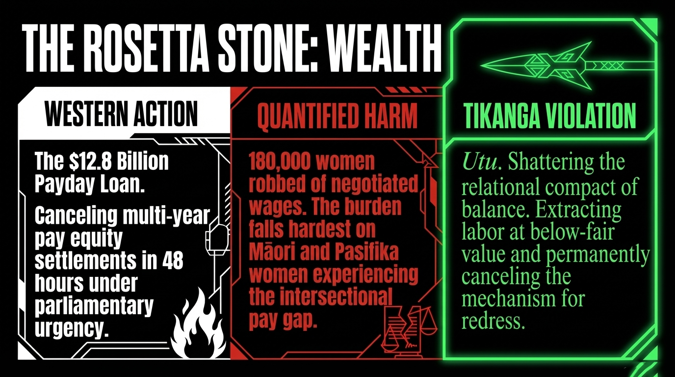 The tikanga dimension: Utu — reciprocity, balance, relational justice — is one of te ao Māori's most foundational concepts. It is not revenge. It is the obligation of balance in all relationships. When a government extracts labour from people at below-fair value and then cancels the mechanism for redressing that imbalance, it has not just committed a legal wrong. It has shattered the relational compact on which any functioning society rests. This is the tikanga violation Amanda Luxon does not mention on Dom Harvey's podcast. As documented in Pinocchio Politics: National's Pay Equity Post Exposed, this was not an accident. It was a plan.