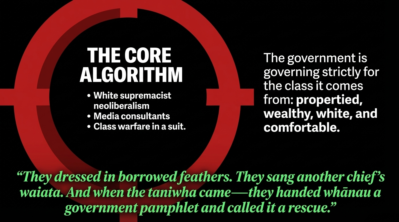 "They dressed in borrowed feathers. They sang another chief's waiata. And when the taniwha came — they handed whānau a government pamphlet and called it a rescue."