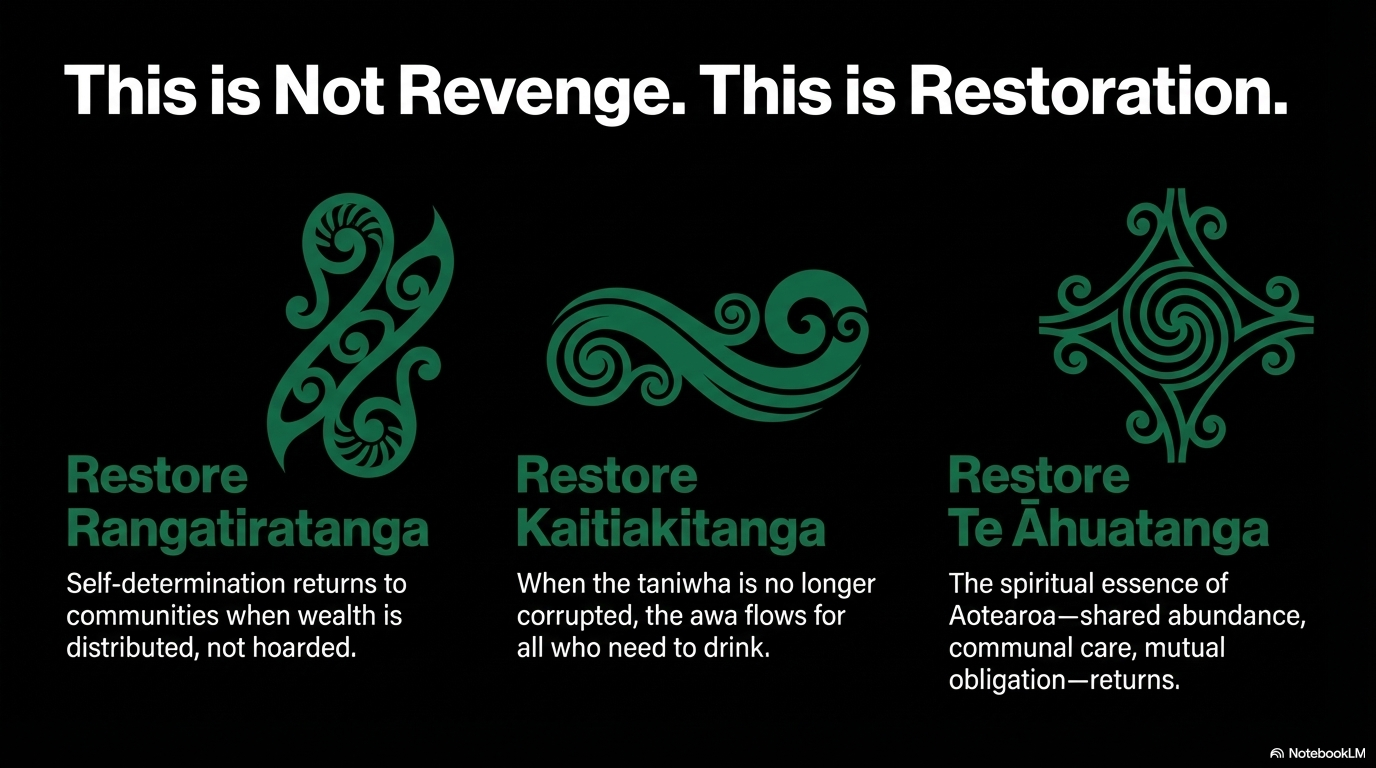 This is not revenge. This is restoration. This is saying: We will not allow a corrupted taniwha to dam our rivers while our children thirst.