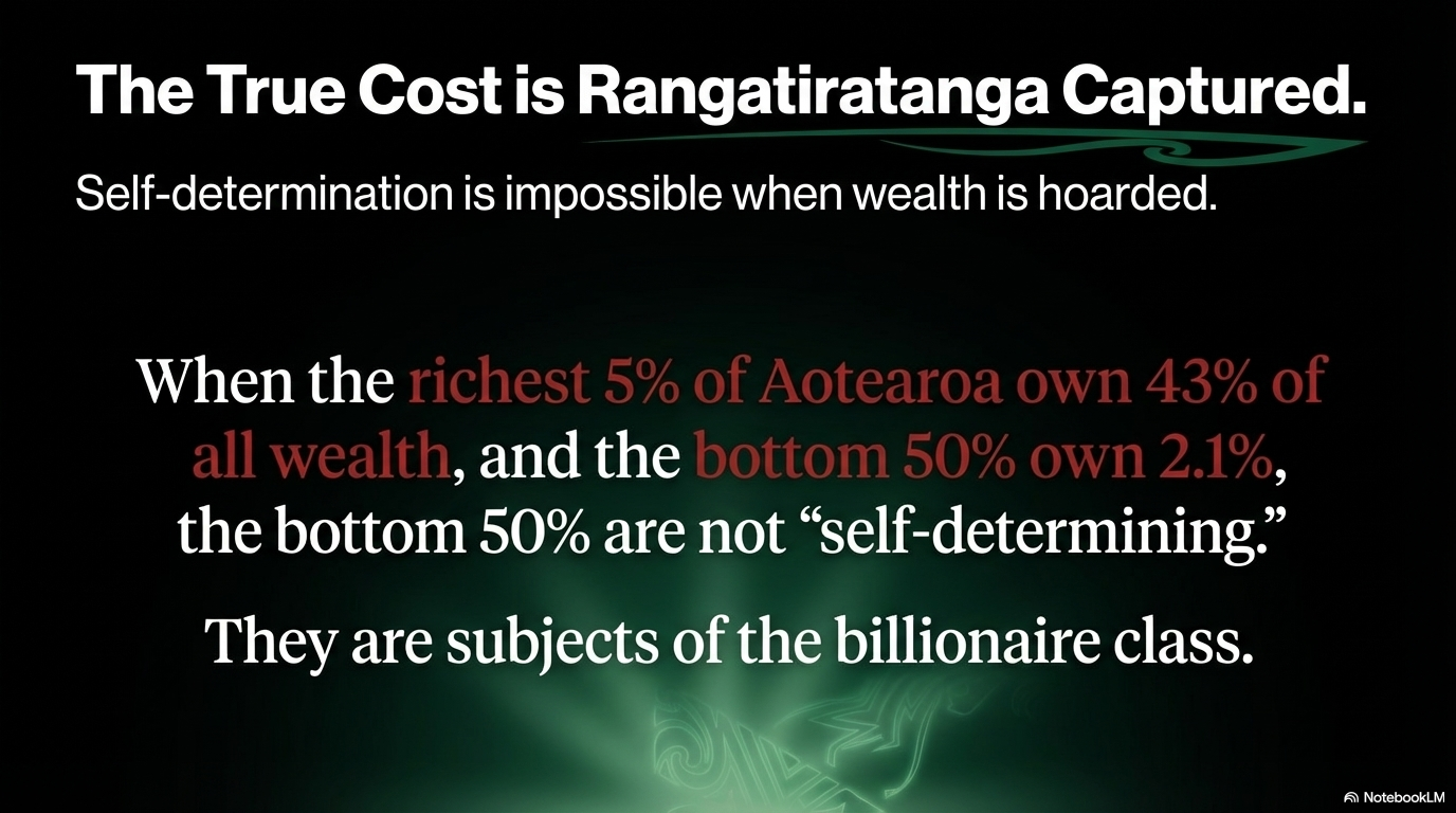 When the richest 5% of Aotearoa own 43% of all wealth, and the bottom 50% own 2.1%, the bottom 50% are not “self-determining.” They are subjects of the billionaire class.