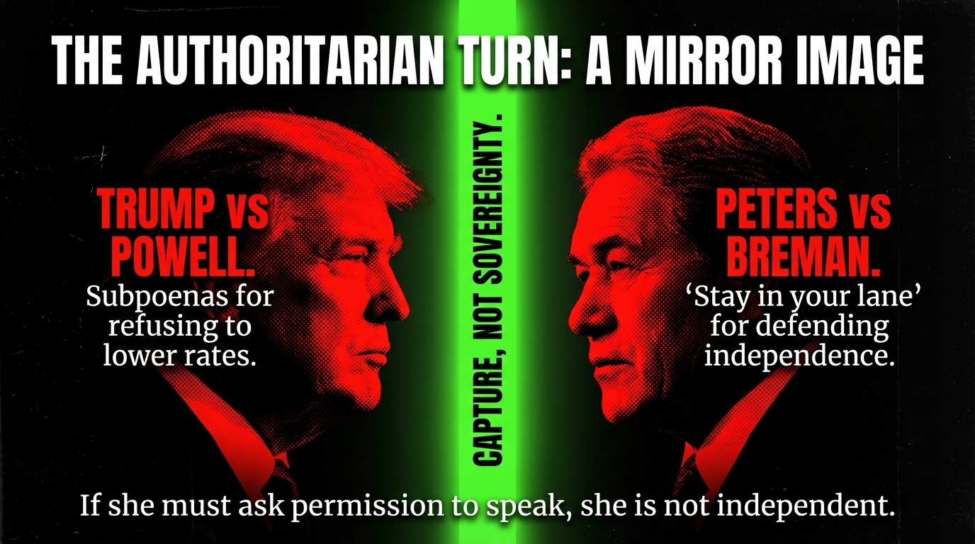 When Peters tells Breman to “stay in her lane,” he is not defending New Zealand sovereignty. He is defending the right of governments—including authoritarian ones—to capture their central banks. This benefits no one except those who want monetary policy subordinated to short-term political gain.