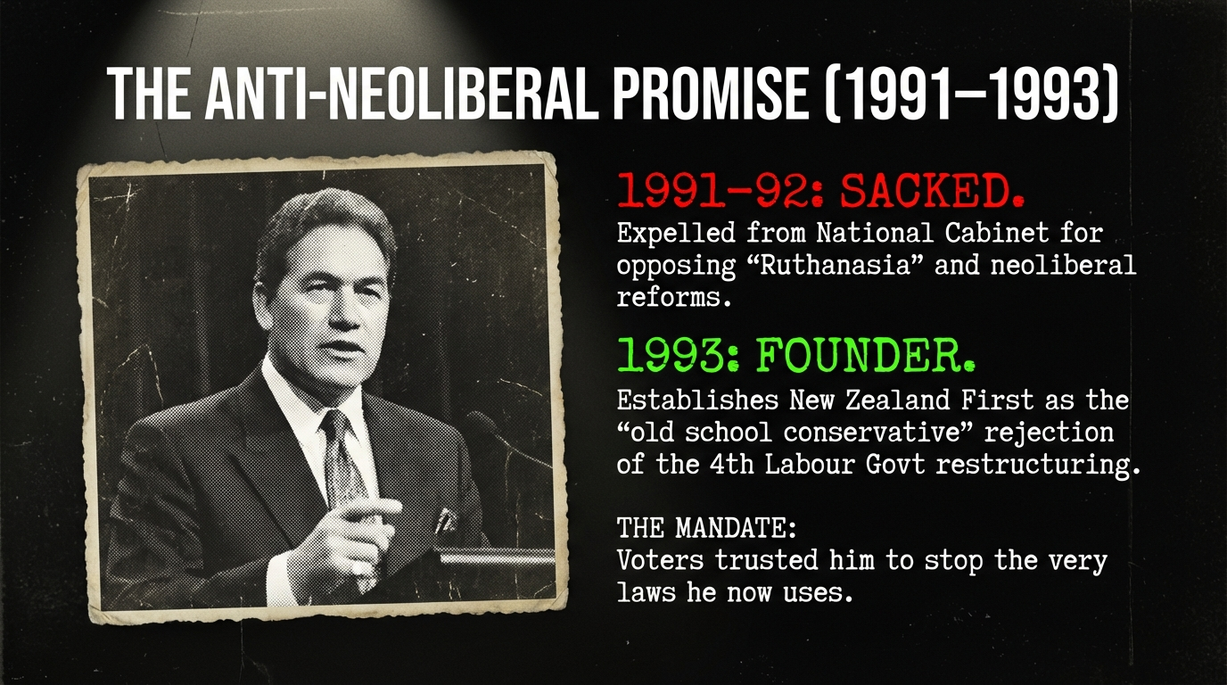 When Peters founded New Zealand First in 1993, it was explicitly as a rejection of neoliberalism. Wikipedia records that the party had “a distinctly Māori character, backed by ex-Labour and National voters alike disenchanted with neoliberalism.” E-Tangata describes him as “an old school conservative” who “had been a staunch critic of the fourth Labour Government’s neo-liberal reforms.”