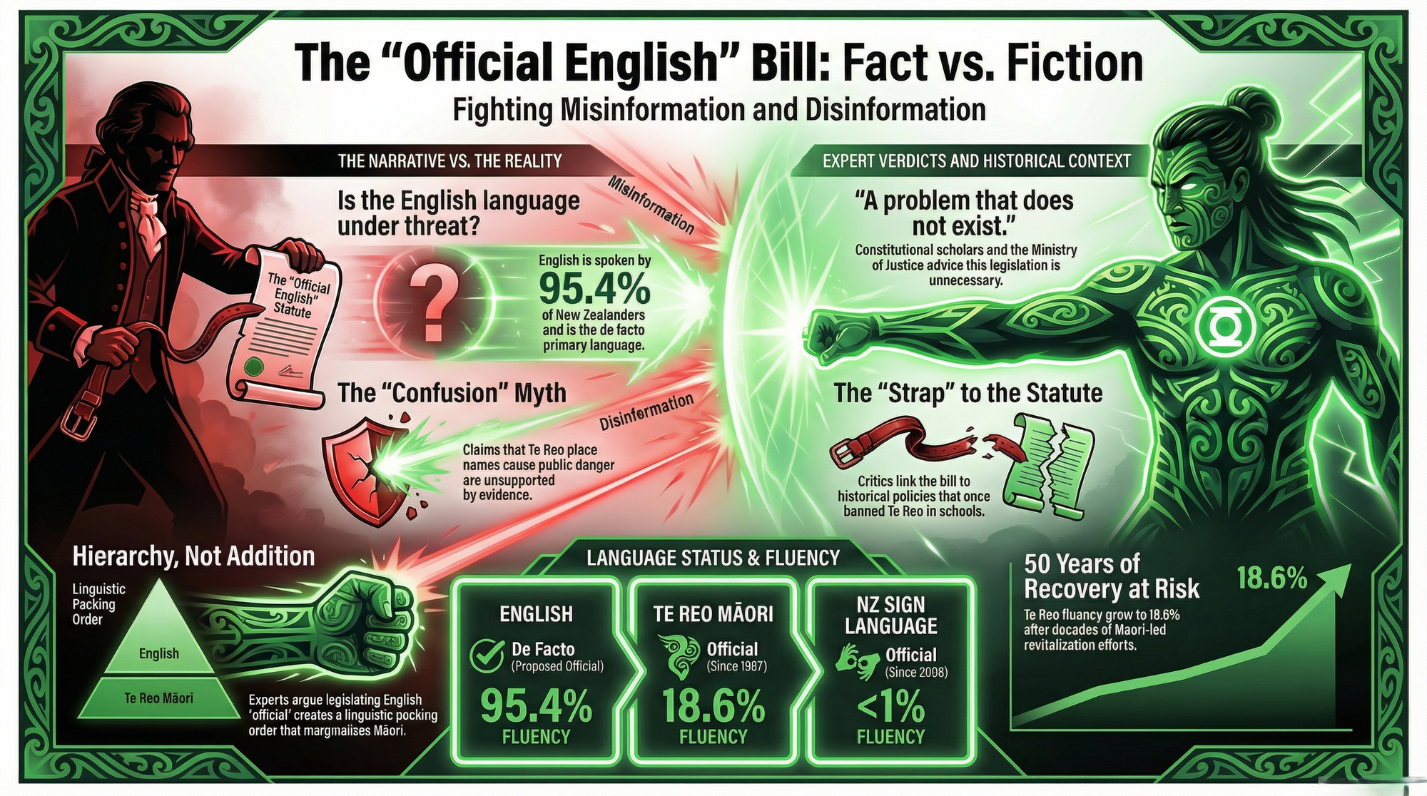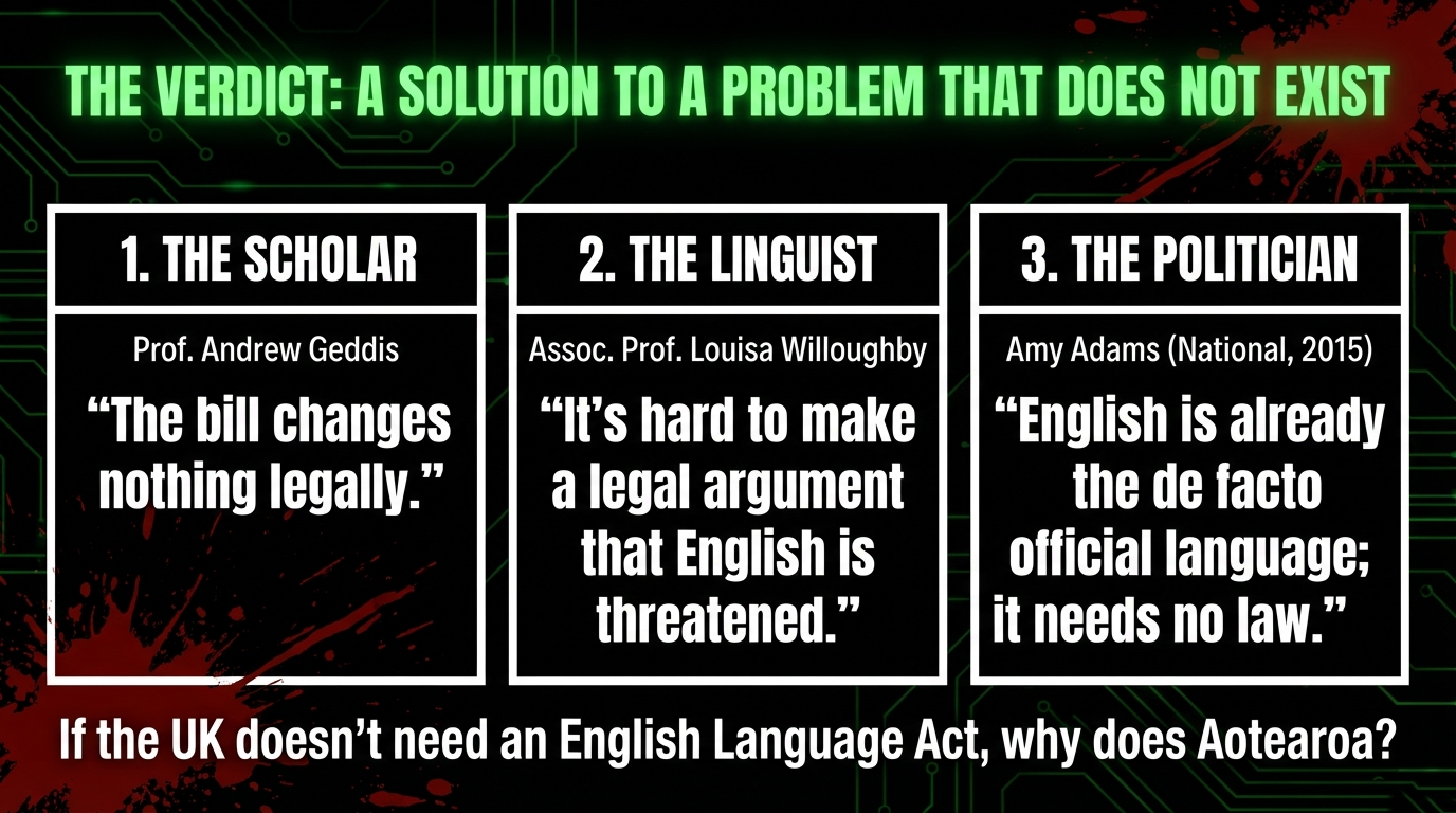 Three experts — a constitutional lawyer, a linguist, and a former National Party Justice Minister — agree: this bill is unnecessary. The Ministry of Justice itself advised the Government that legislating English as official is not necessary. The Government proceeded anyway, because this bill is not about language. It is about power.