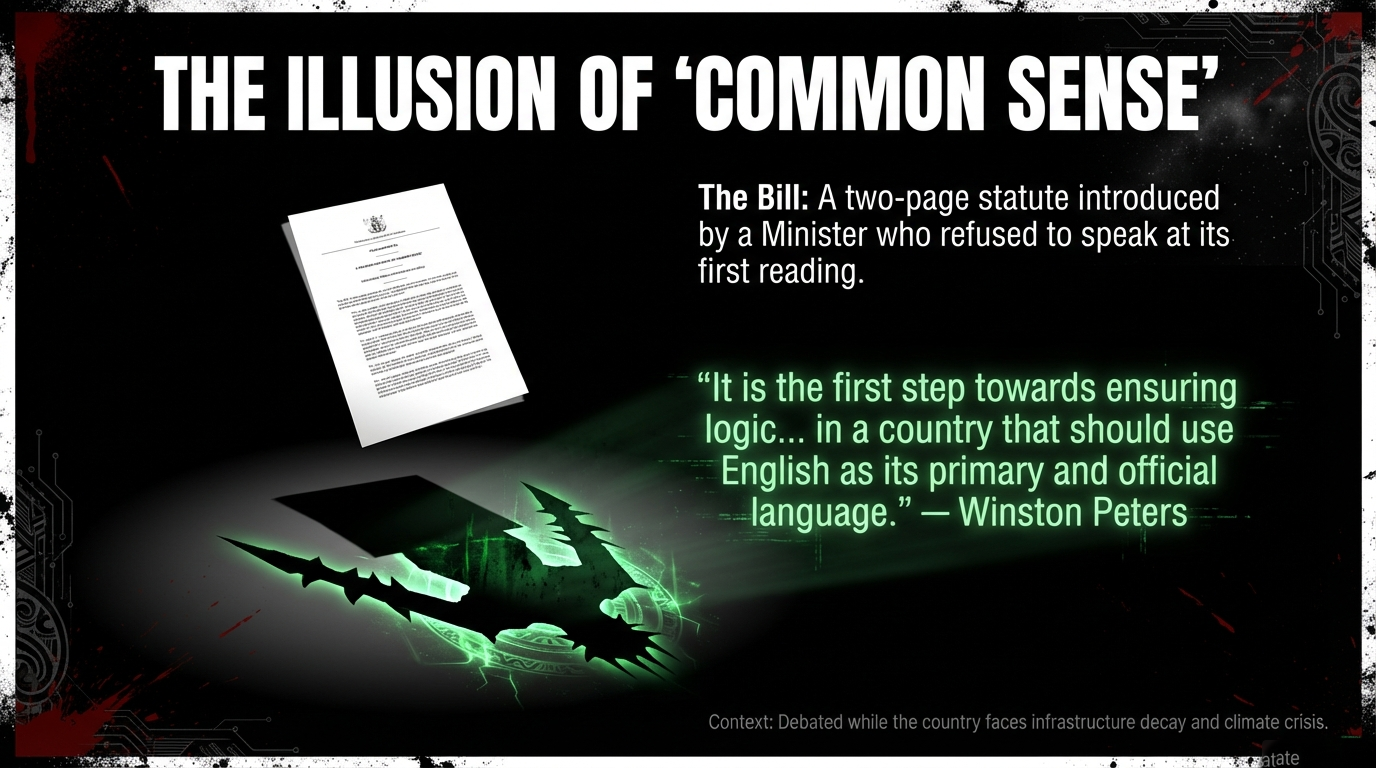 On Thursday 20 February 2026, the New Zealand Parliament debated a bill to make English an official language. A two-page piece of legislation — two pages, the same length as a parking ticket — that Winston Peters promoted on social media like a boxing match, that Paul Goldsmith couldn't even be bothered to speak to in the House, and that the Ministry of Justice itself has advised is unnecessary.