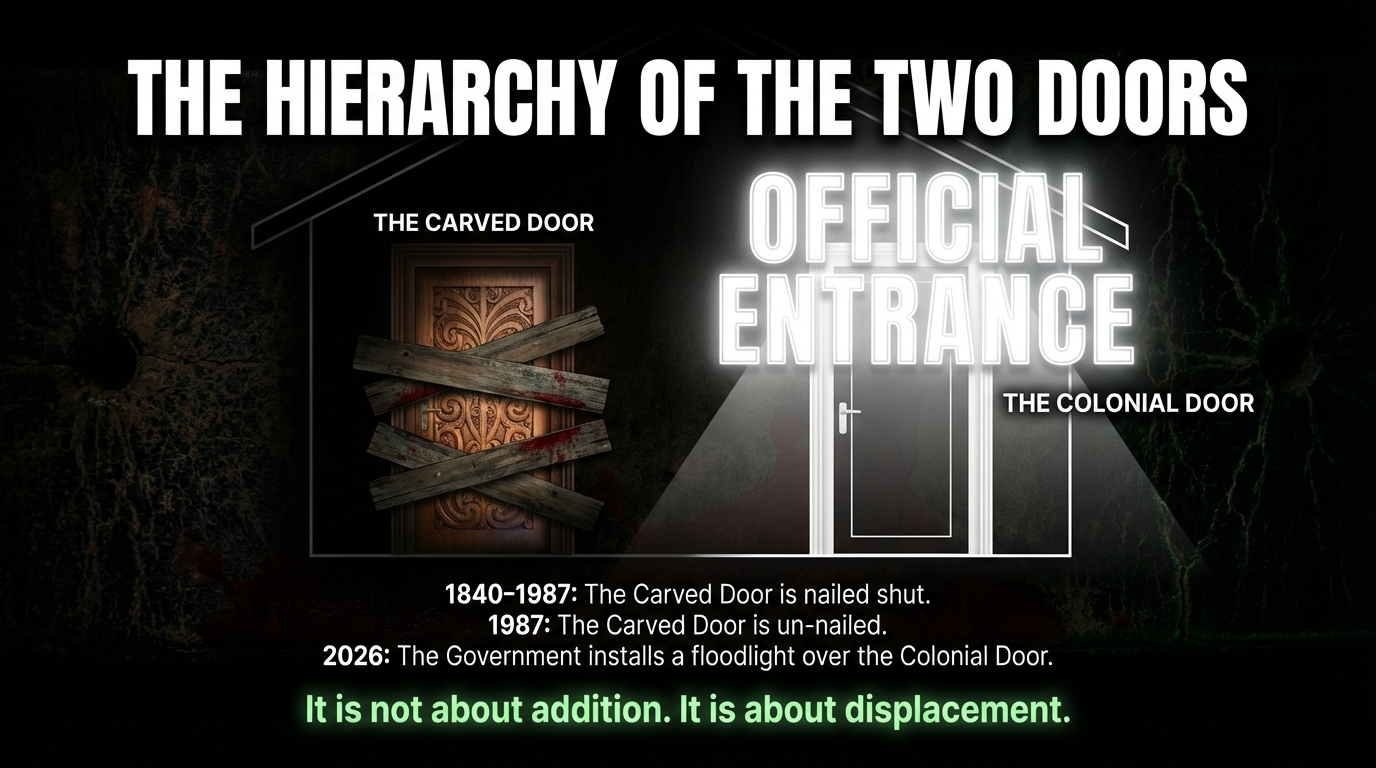 The effect is identical. The carved door recedes into shadow. The message to every New Zealander is clear: the colonial door is the real door. The carved door is heritage decoration. Te reo is a museum exhibit in a country that speaks English.
