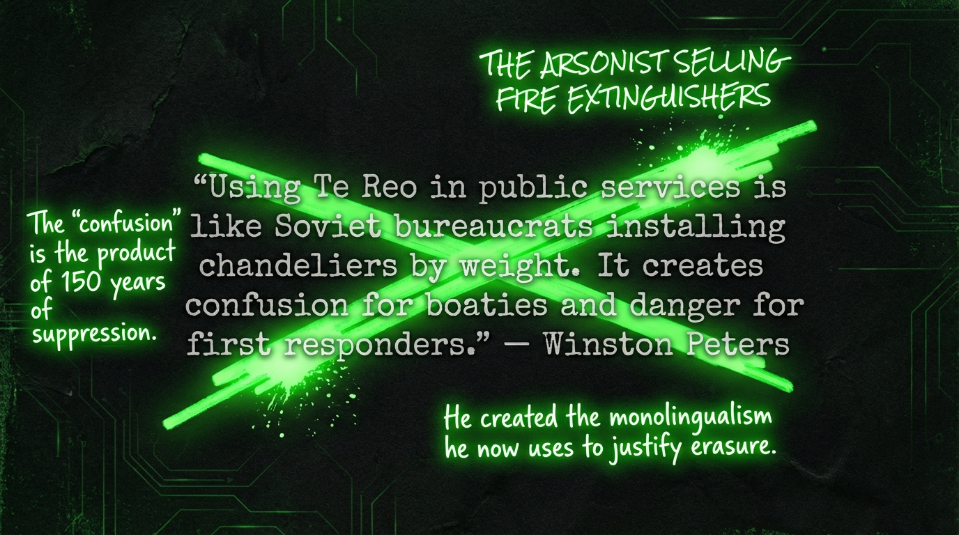 Peters's argument is the arsonist selling fire extinguishers. The Crown suppressed te reo for 150 years. It created a monolingual English-speaking population. Now it points to that monolingual population and says: "See? Nobody speaks Māori. English should be official." The very "confusion" Peters describes is the product of Crown policy — a policy this bill extends.