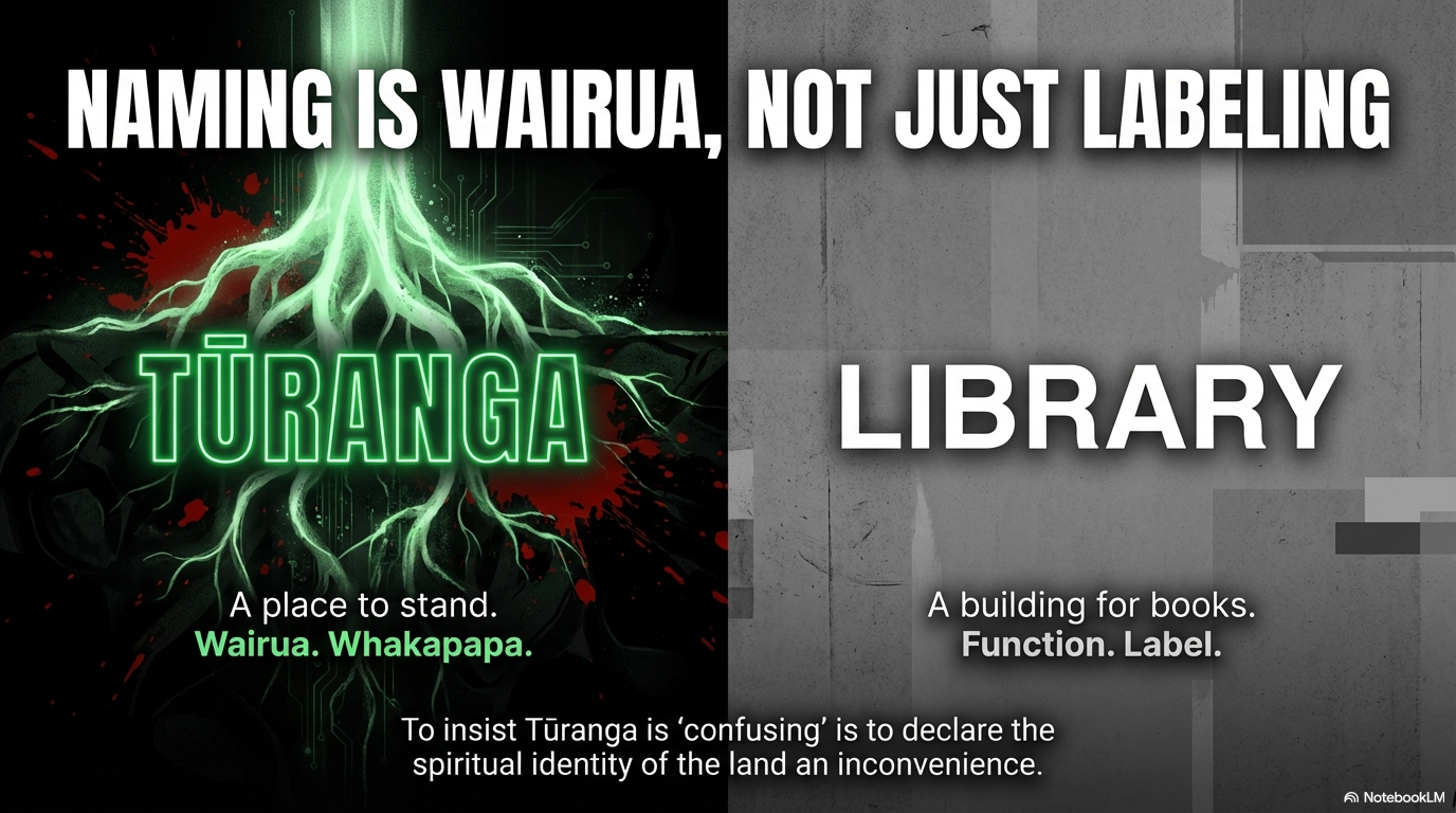 Tikanga impact: In te ao Māori, naming is not labelling — it is the bestowal of wairua (spirit). When a place is named in te reo, it is connected to the whakapapa of the land, to the atua, to the tūpuna who walked there before concrete existed. Tūranga means "a place to stand" — it references the mana of Ngāi Tahu's relationship to that whenua. To insist this name is "confusing" is to declare that the spiritual identity of the land is an inconvenience to the coloniser's comfort.