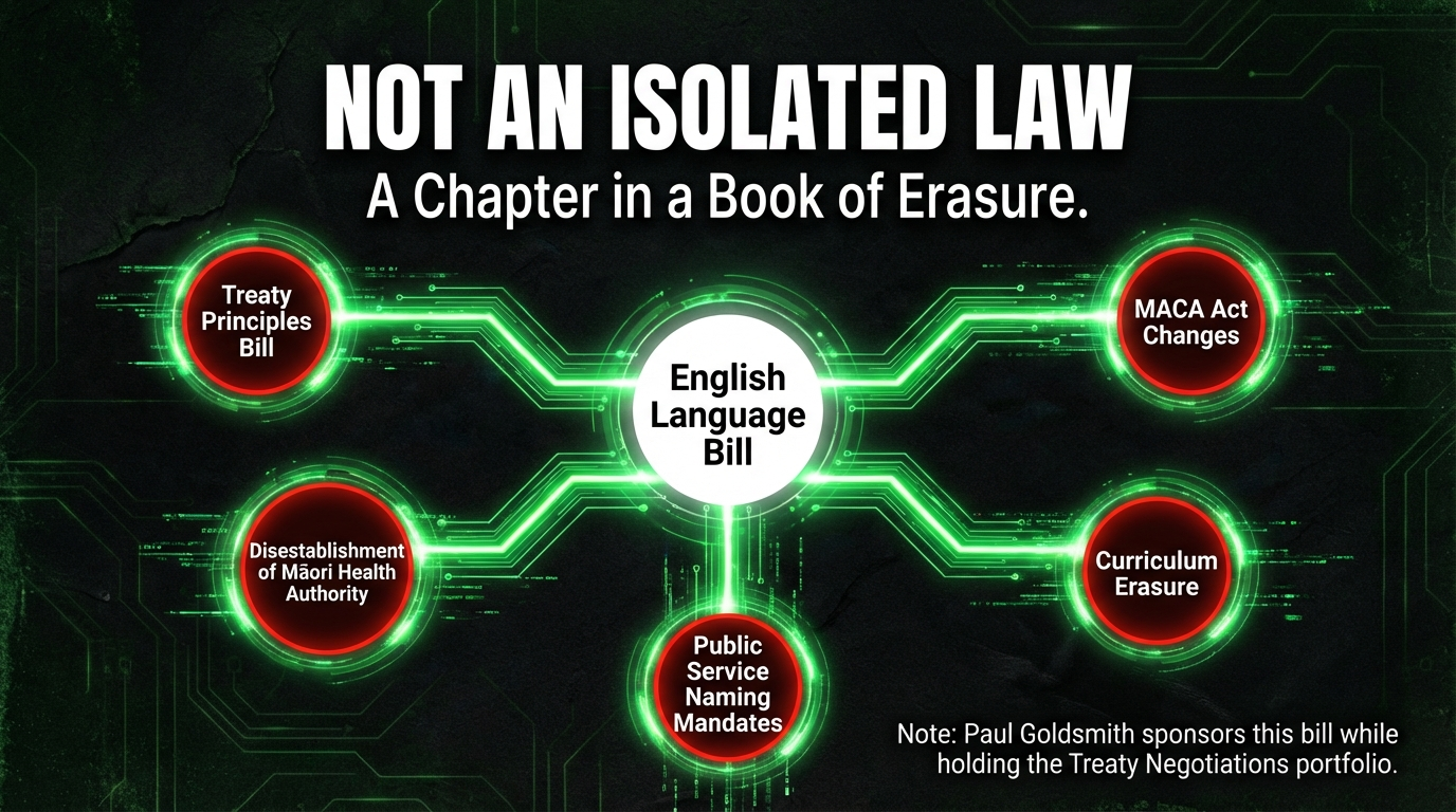 - The bill arrives the same week Peters campaigns to abolish the Māori seats — this is not coincidence. This is a coordinated campaign: strip the language, strip the seats, strip the Treaty principles. Each piece enables the next. Once English is "officially" primary, arguing for Māori language rights in governance becomes "special treatment." Once the seats are gone, the voices demanding those rights are silenced.