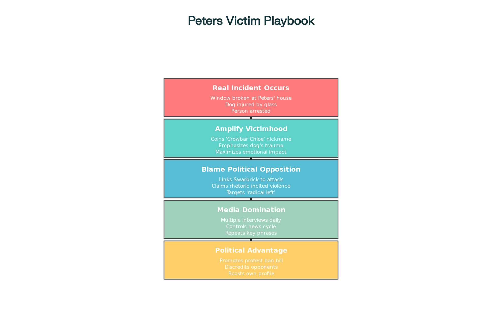 This playbook follows the exact same pattern Trump uses. Research shows Trump strategically claims victimhood to justify retaliatory policies, constantly positioning himself as a persecuted martyr while attacking his opponents. Peters has imported this tactic wholesale, using a genuine criminal act to launch political warfare against his opponents.