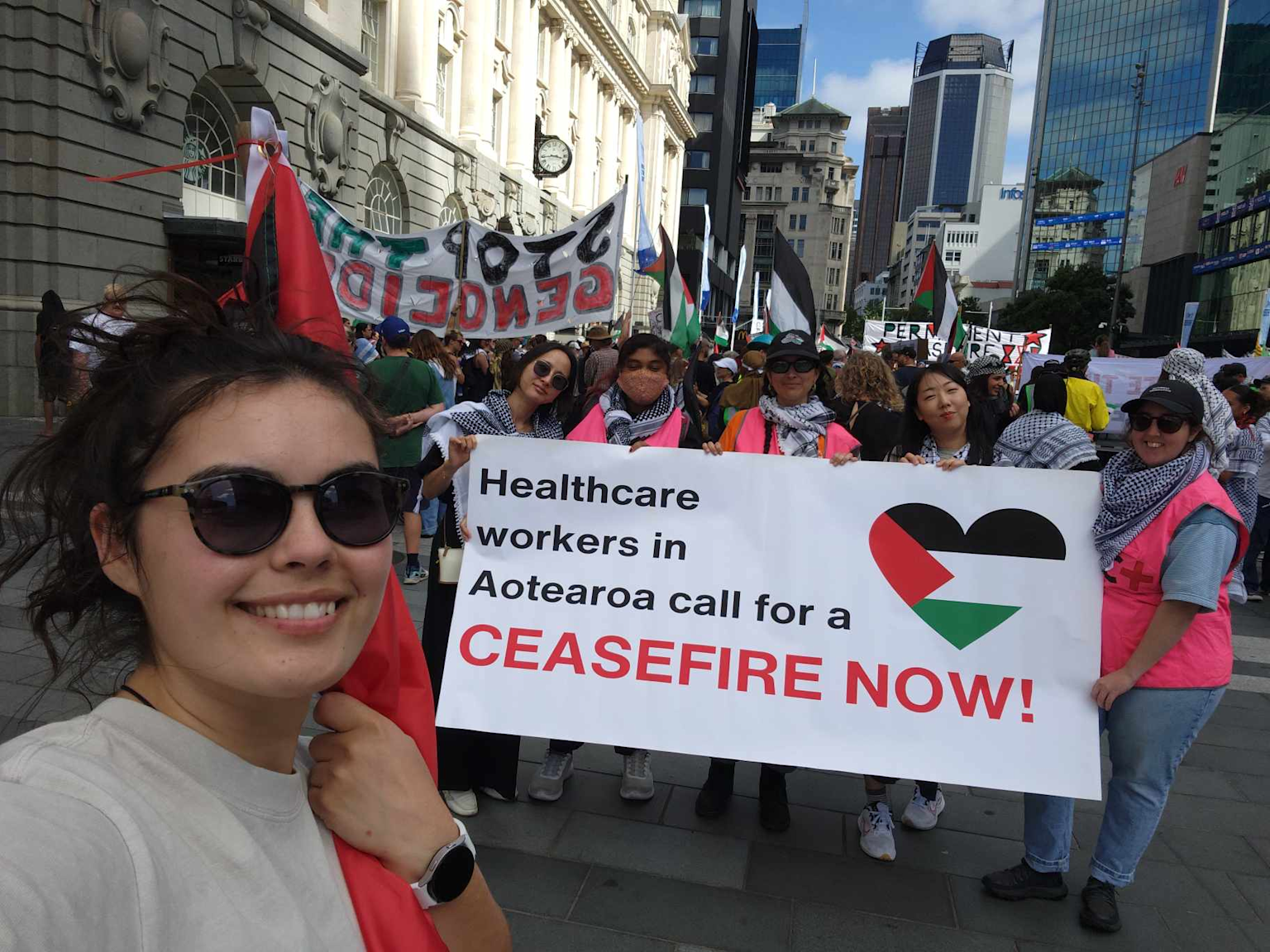 Healthcare workers in New Zealand protest for an immediate ceasefire in Gaza, showing solidarity with Palestine