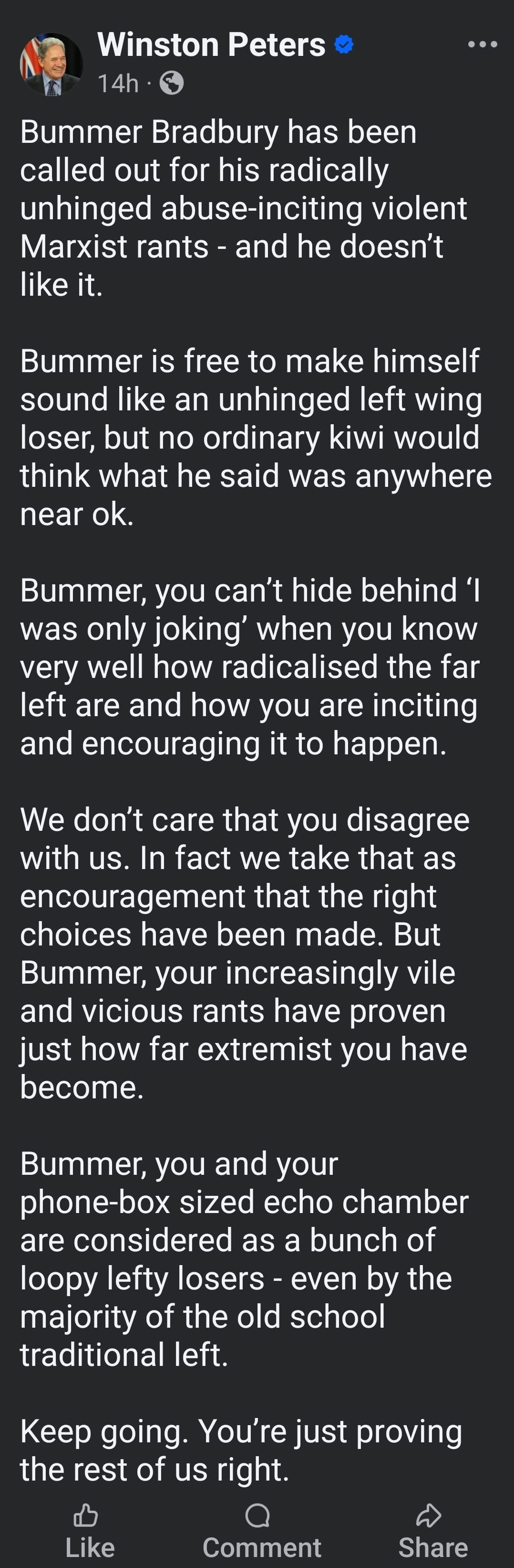 Peters’ approach to dissent reveals the true authoritarian lurking beneath his populist mask. When protesters interrupted his “Make New Zealand First Again” speech in Christchurch, his response was telling. He didn’t engage with their concerns or defend their right to protest - instead, he labeled them “fascists” and “communist, fascist and anti-democratic losers.”