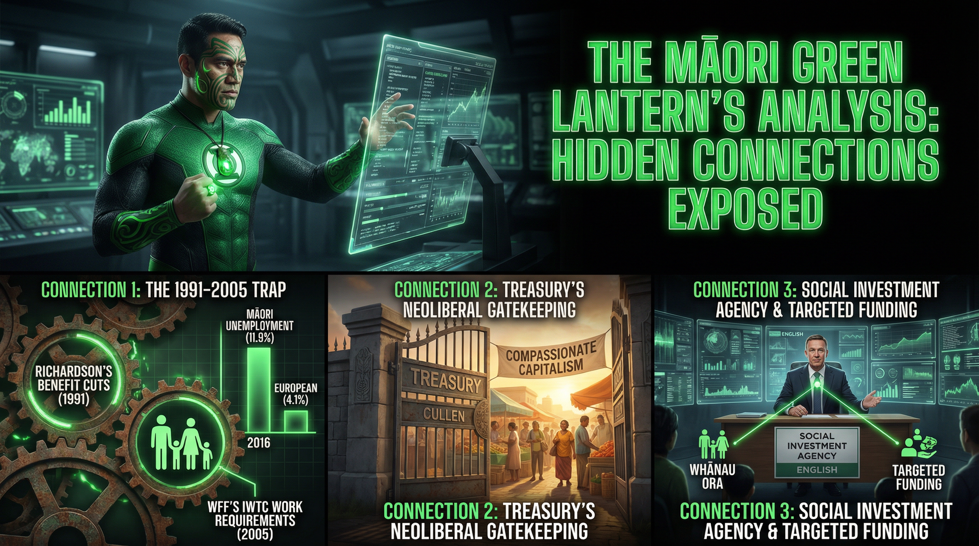 Working for Families (WFF), introduced in April 2005 and celebrated as “the biggest welfare reform of the 21st Century,” is a masterclass in misdirection. The NZ Herald’s anniversary piece presents a narrative of policy triumph: poverty fell, families got more income, Treasury objected but was overruled. But The Māori Green Lantern sees what’s missing from that whitewashed history—a network of structural exclusions that have locked hundreds of thousands of Māori children, beneficiaries, and whānau out of dignity while claiming to lift them up.