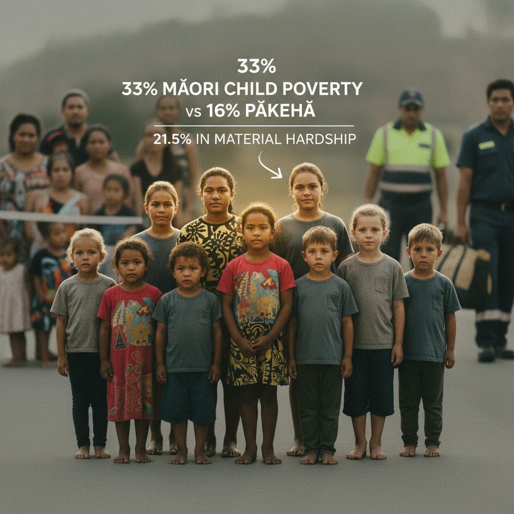 - 21.5% of Māori children in material hardship vs. 9% overall (2024).