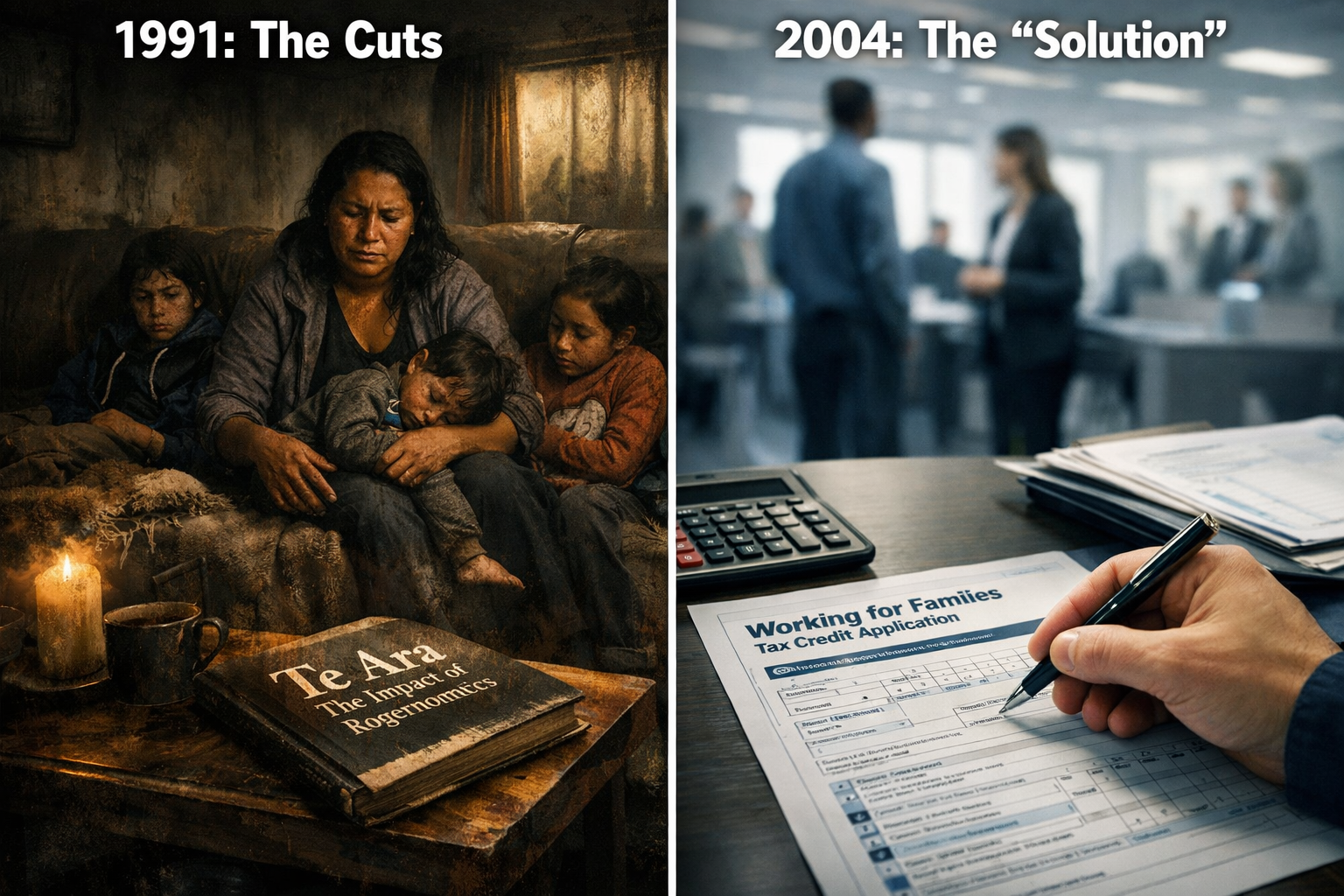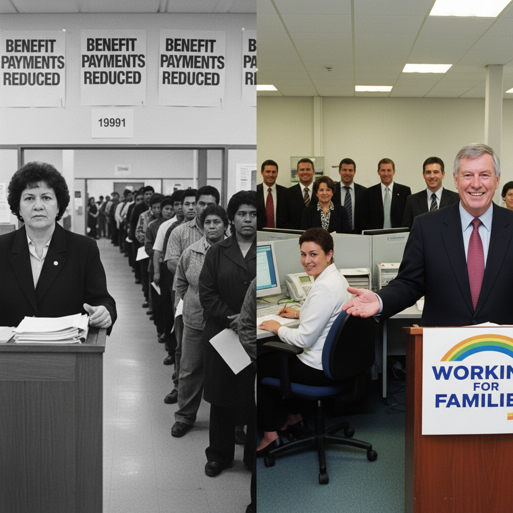 Richardson’s benefit cuts (1991) + WFF’s IWTC work requirements (2005) = a two-decade policy design that said to struggling whānau: “Work or your children starve, but we’ve cut your benefit base and locked you out of tax credits if you can’t find formal work.”