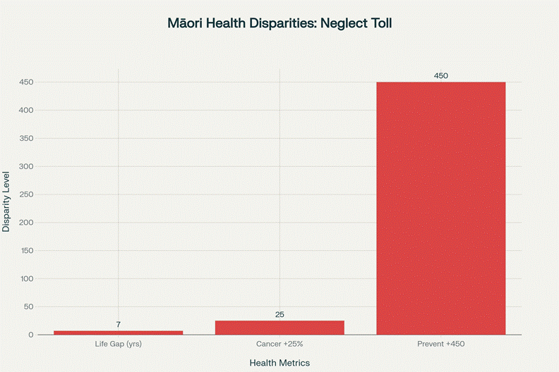 Māori experience seven-year life expectancy gap, 25% excess cancer mortality, and 450 additional preventable deaths per 100,000 population compared to non-Māori—consequences of neoliberal health policy gutting Māori Health Authority and co-governance structures.