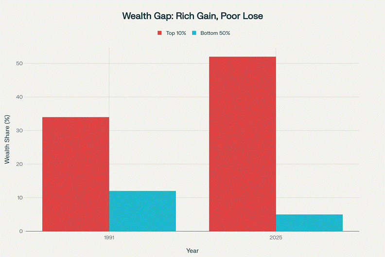 The top 10% nearly doubled their share of wealth (34% to 52%) while the bottom 50% saw theirs collapse (12% to 5%). This isn’t market efficiency—it’s organized wealth transfer from communities to billionaires.